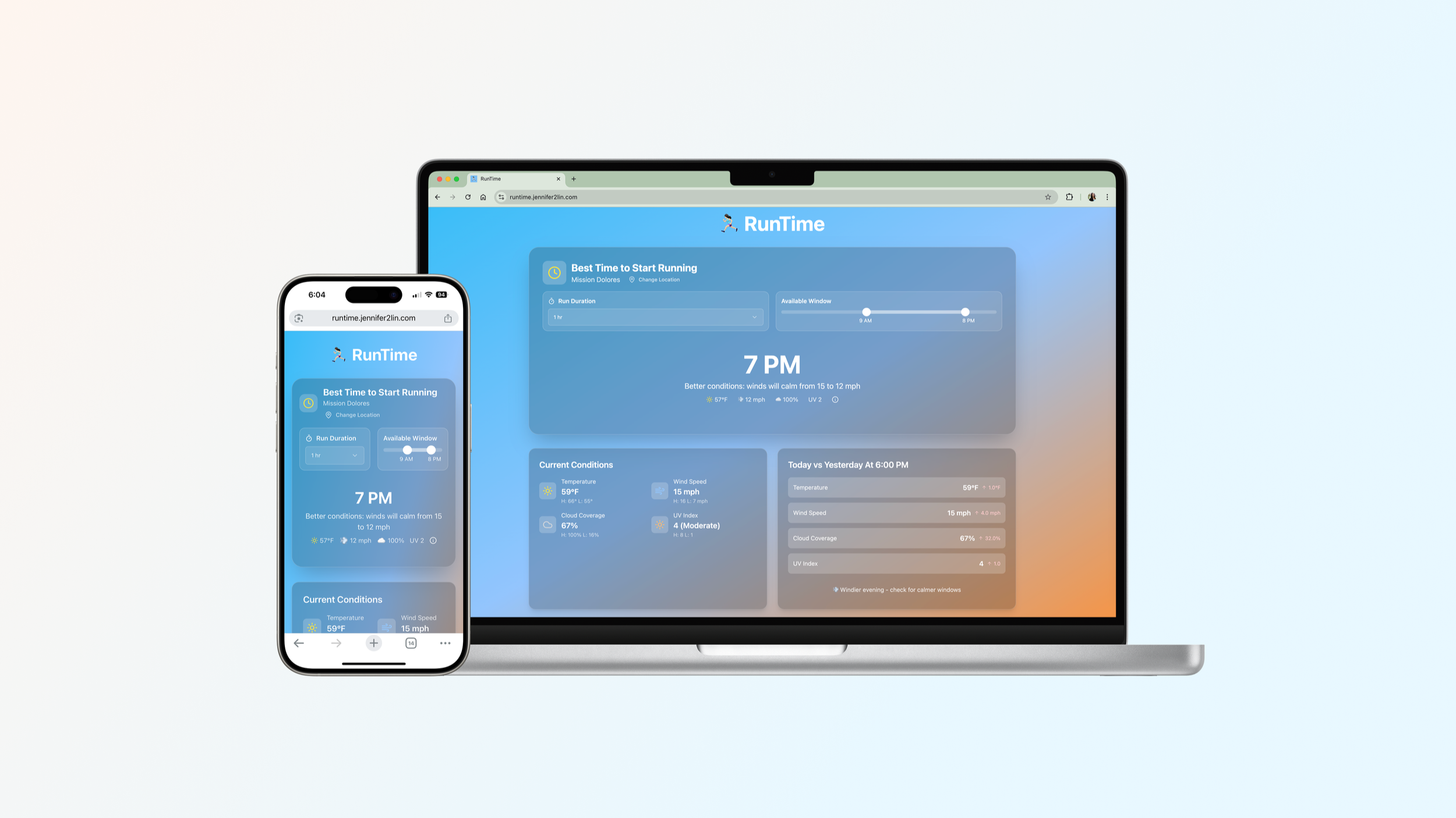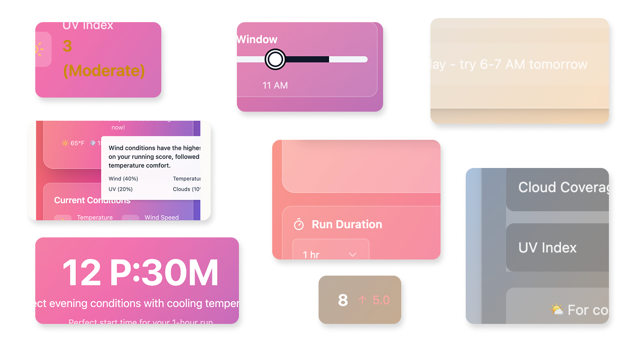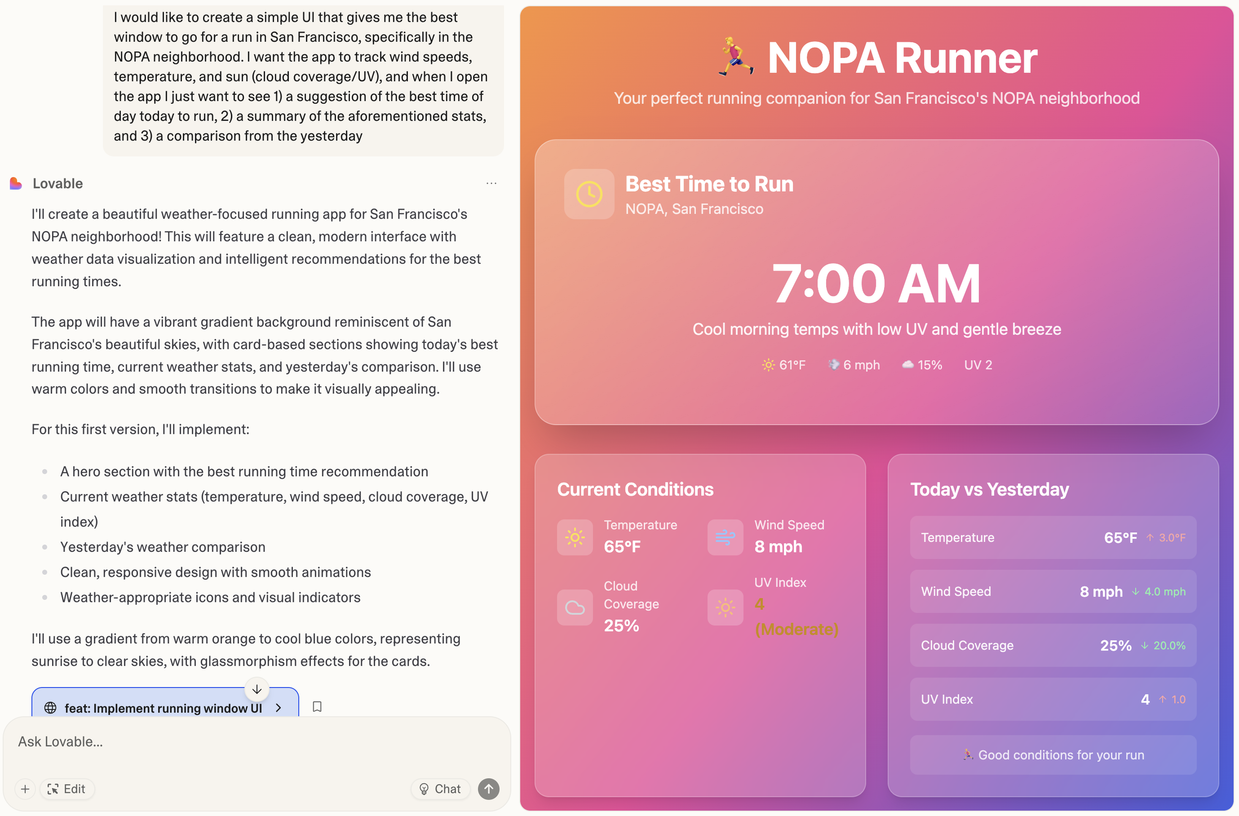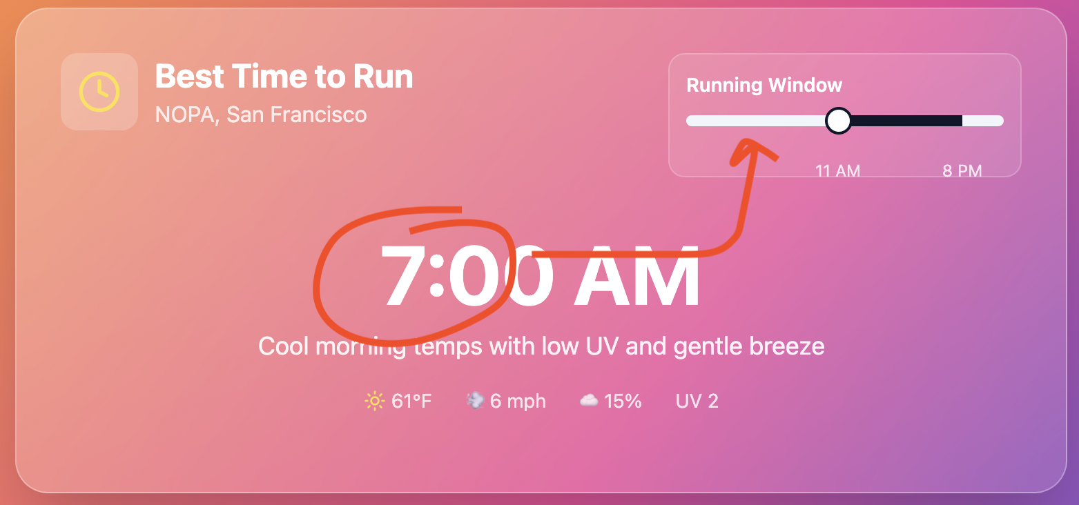 Prompt: I would like to create a simple UI that gives me the best window to go for a run in San Francisco, specifically in the NOPA neighborhood. I want the app to track wind speeds, temperature, and sun (cloud coverage/UV), and when I open the app I just want to see 1) a suggestion of the best time of day today to run, 2) a summary of the aforementioned stats, and 3) a comparison from yesterday
