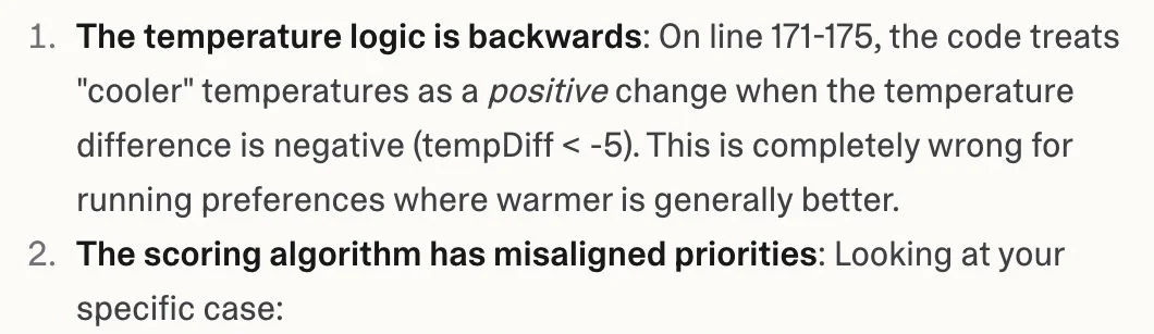 Another logic issue I ran into with Lovable that would’ve been quickly seen as an issue by human eyes was that although I asked it to add in a slider for my available running window, my suggested run time was still outside of my window. It was only once I sent this screenshot to Lovable and used up some more credits that it realized its mistake and fixed the problem. I could feel the sarcasm dripping off its robotic response, the subtext saying: Ohhhhh, I didn’t know you actually wanted me to factor in the time window, why didn’t you say that the first time around?