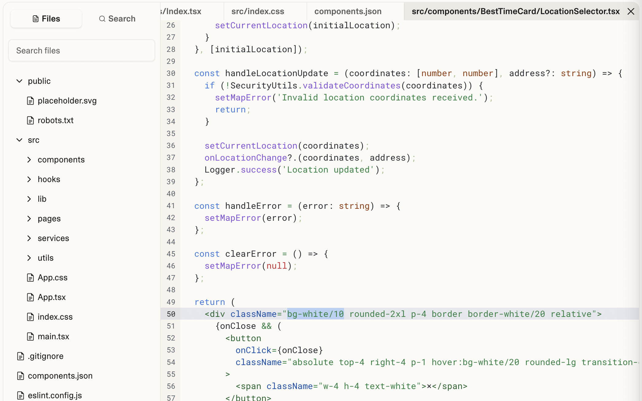 I decided to open up the code editor and take a look under the hood. For someone who has no idea what language Lovable’s even using, this (below) is a terrifying thing to see, but I honed in just on the bg-white/XX and attempted to change the opacity. That much I could figure out.